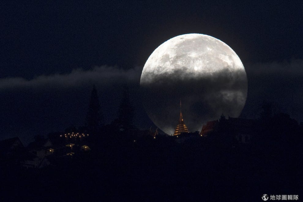 路透社圖拍攝於泰國雙龍寺。由於月亮繞行地球的軌道是橢圓形的,所以對地球才會有忽遠忽近的情況發生。