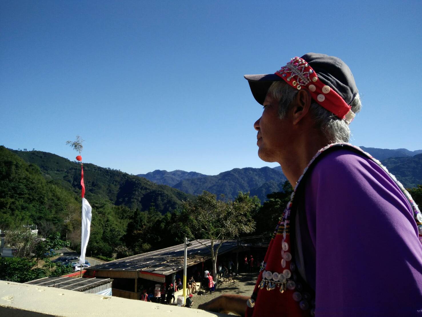 地球圖輯隊等肩旗通過以後,族人們就吟唱祭歌從祭屋走出來,跟著走入祭場。