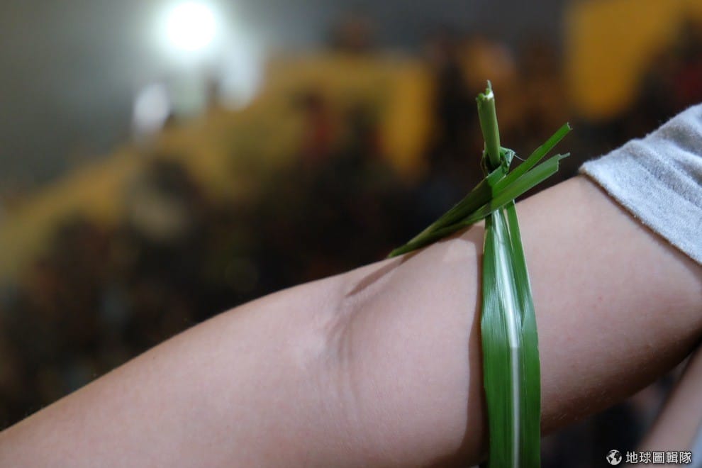 地球圖輯隊一到現場,大家就被招呼到祭屋綁芒草。祭屋是所有儀式開始、舉辦的場所,其右方「靈屋」是矮靈的「駐蹕」(指矮靈在祭典期間停留休息的地方),左方是為矮靈準備食物的廚房,兩邊都被視為神聖地區,因此嚴禁外人進入、拍照。