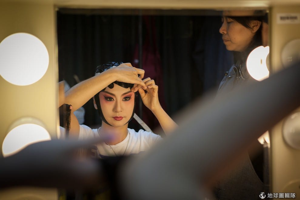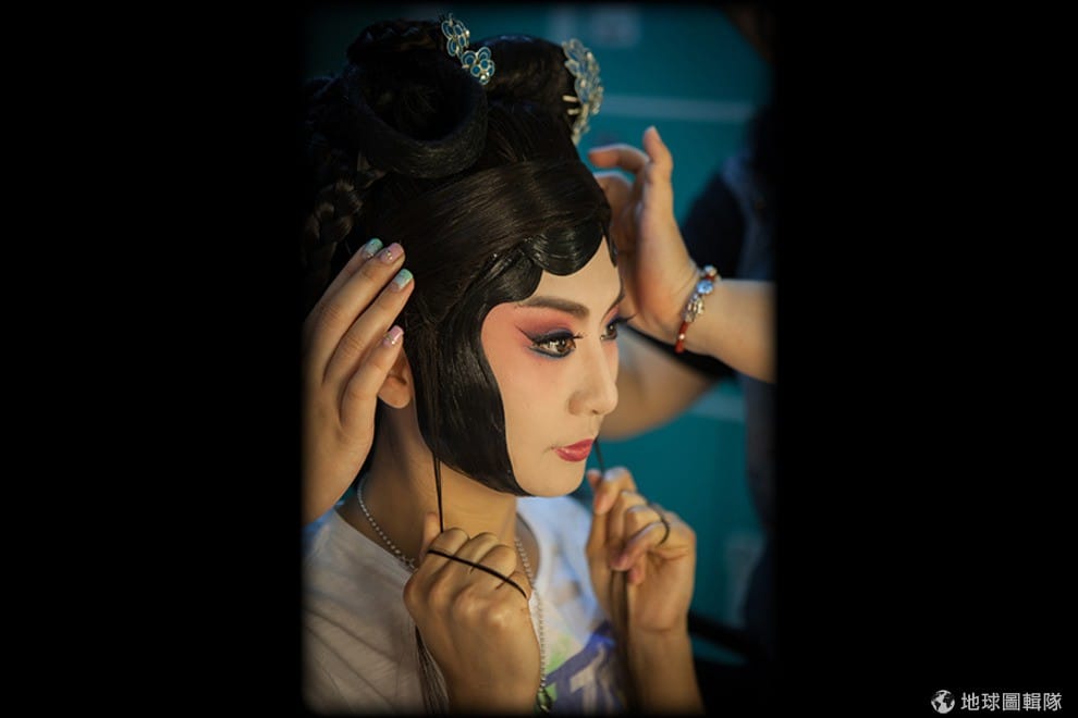 要完成旦角的髮型,需要經過很多道程序,先分別黏上兩邊的鬢髮,接著貼上瀏海,在頭上綁帶子、套上髮網固定,最後再戴上造型華麗的假髮。