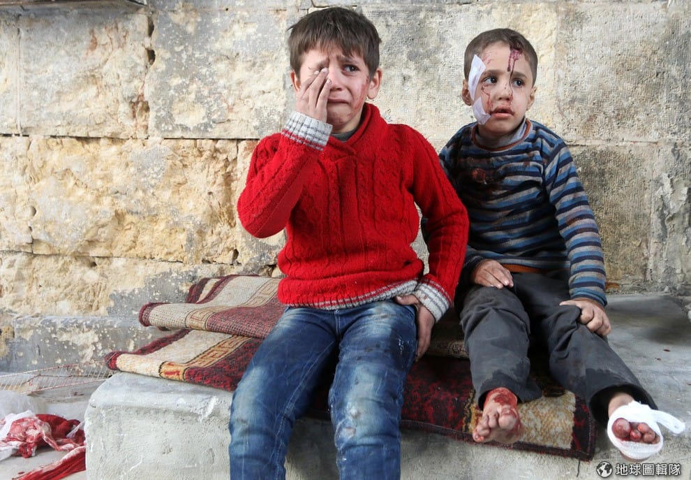 空襲後受傷的孩童坐在戰地醫院,對剛結束的空襲行動感到驚慌不已。
