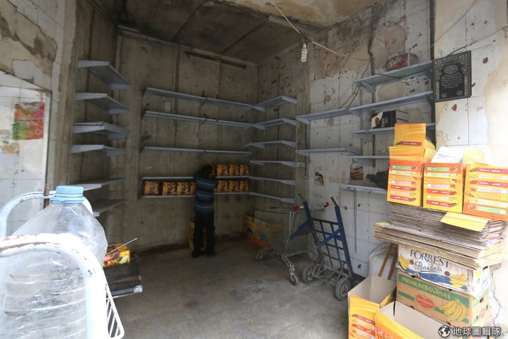 一名男孩在雜貨店裡尋找可用物資,照片中可以看到店內幾乎空空如也。