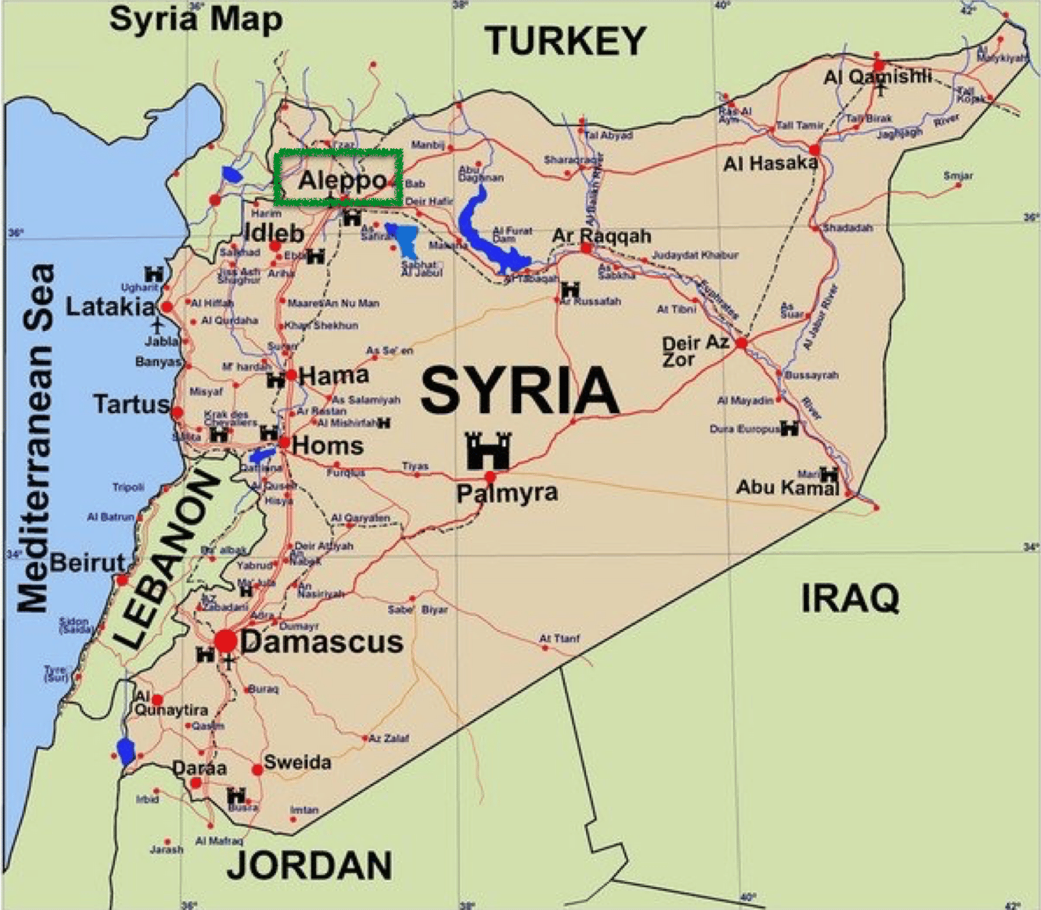 路透社圖為敘利亞內阿勒坡城的位子圖(左上角的綠框Aleppo),俄國大使最近聲稱空襲是為了幫助伊拉克在進行的戰爭,但是阿勒坡城與伊拉克明顯有段距離。