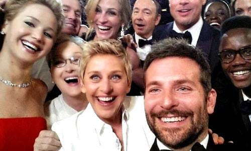 圖為 2014年美國奧斯卡頒獎典禮上,主持人艾倫狄珍妮(Ellen Lee DeGeneres,中)和眾影星的自拍照。