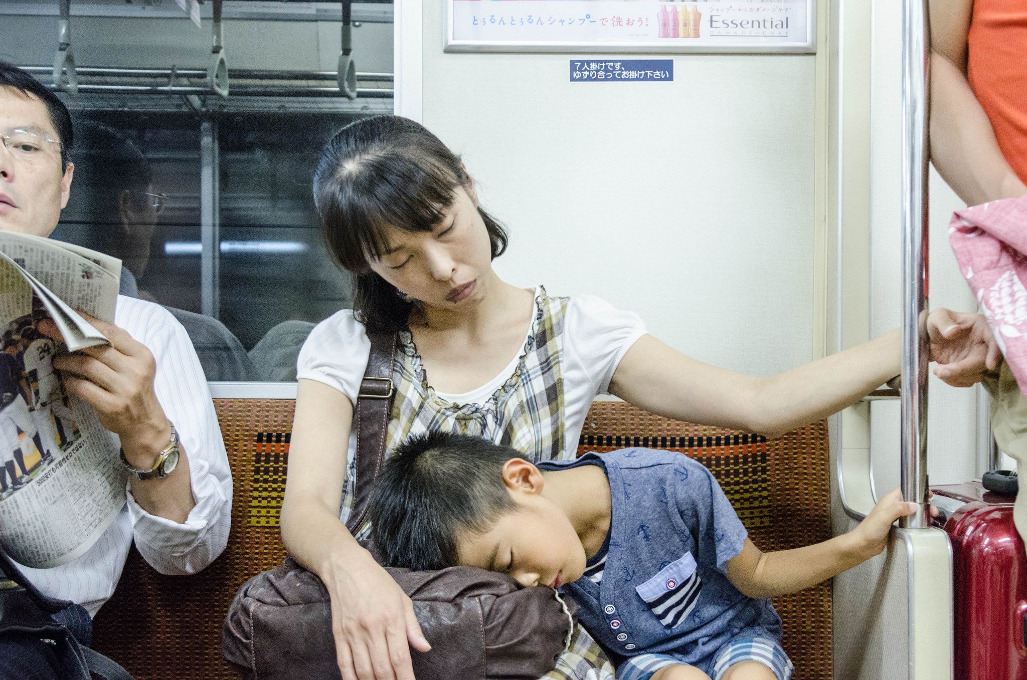 在日本,讓座的學問大得很,有民眾認為老人和大腹便便的孕婦搭乘大眾交通工具,是給一旁的乘客添麻煩。圖為一對在電車上睡著的母子。