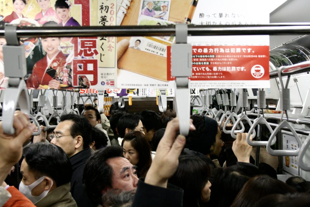 在上下班的尖峰時刻,日本電車中多得是洶湧的人潮,大家被擠得像沙丁魚一樣等著前往目的地。