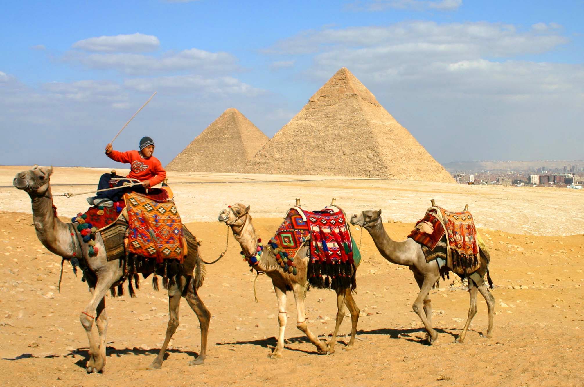 圖為觀光客到埃及必定造訪的金字塔,一名男孩帶著三隻駱駝準備讓觀光客體驗當駱駝客的滋味。