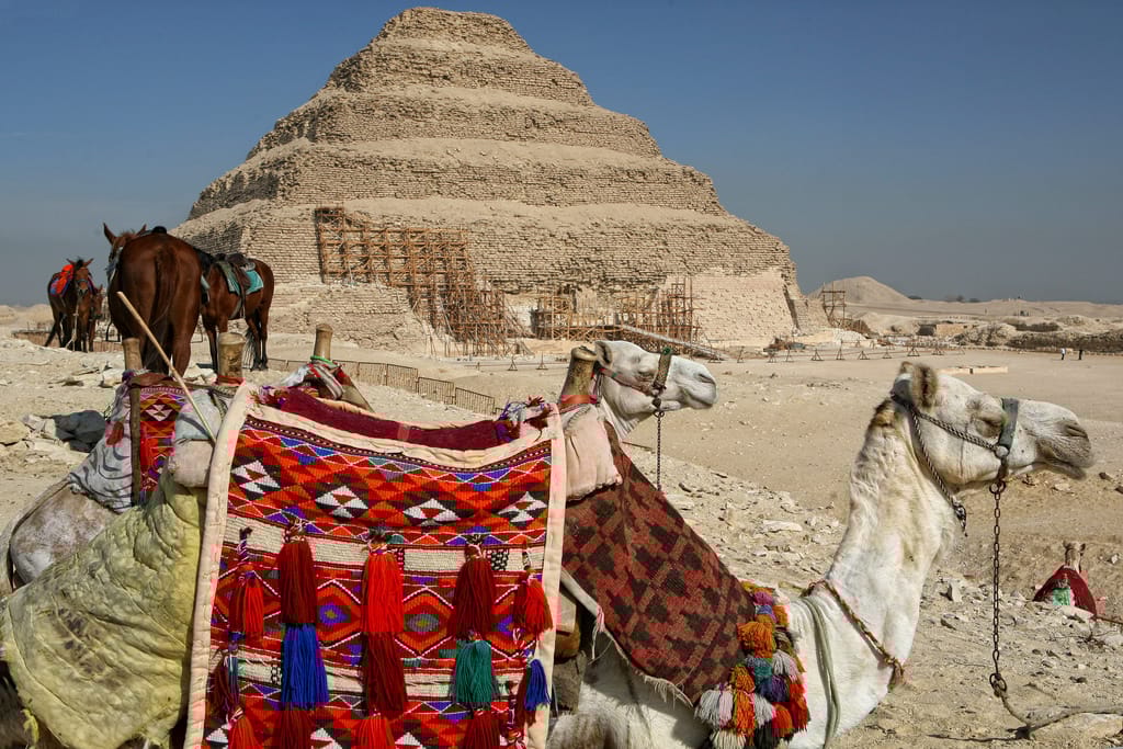在裝飾華麗的駱駝身後,是埃及最古老的金字塔──階梯金字塔。