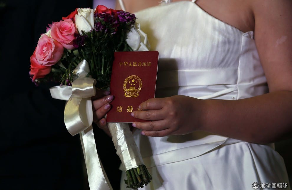在尚未實現婚姻平權的中國,許多人靠著形式婚遮掩同志身分。圖為一名拿著中國紅色結婚證的新娘。