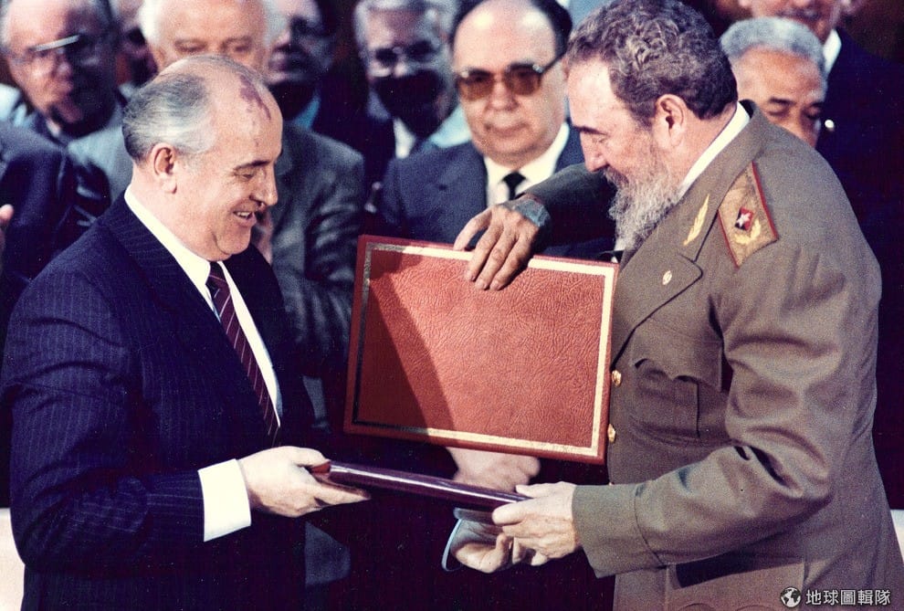 圖為 1989年,蘇聯共產黨中央委員會總書記戈巴契夫(Mikhail Gorbachev,左)與菲德爾卡斯楚(右)簽署條約的畫面。蘇聯作為社會主義國家,在瓦解前是許多社會主義國家的堅定盟友。