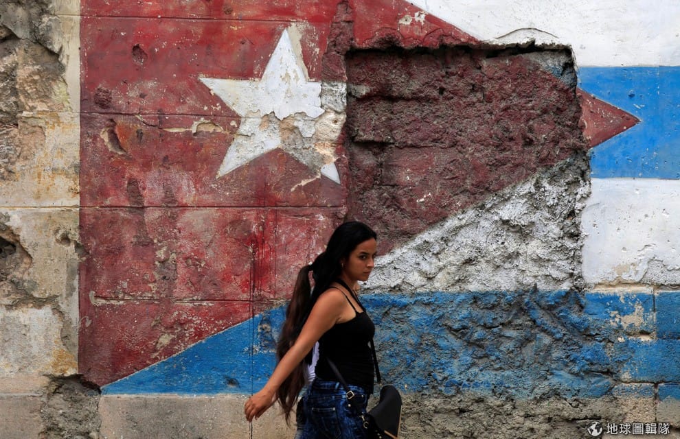 一名女子走過畫有古巴國旗的壁畫,接下來大家都在看卡斯楚政權會怎麼走。