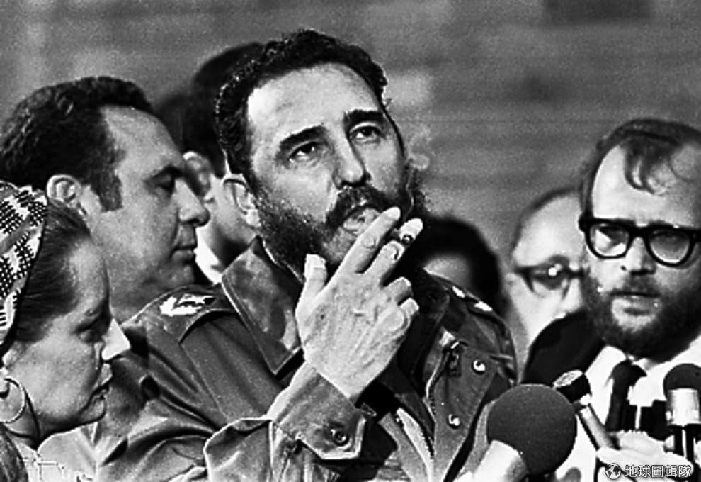 圖拍攝於 1975年,抽著雪茄的菲德爾卡斯楚正準備接受媒體訪問。