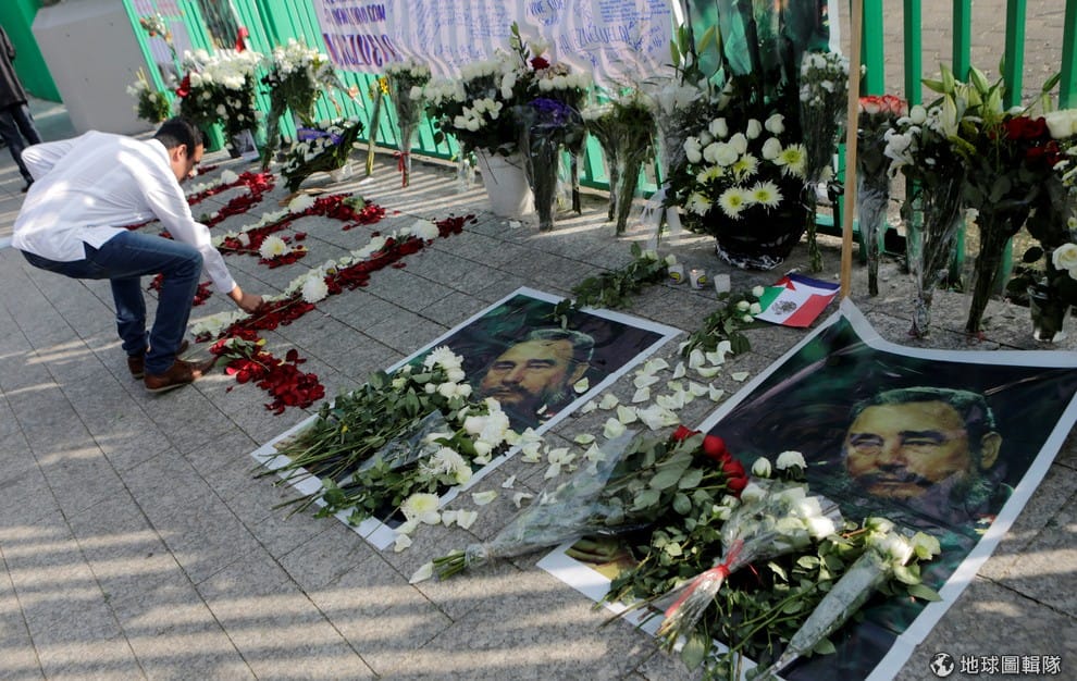 在墨西哥的古巴領事館外,許多人也擺上向菲德爾卡斯楚致敬的花束。