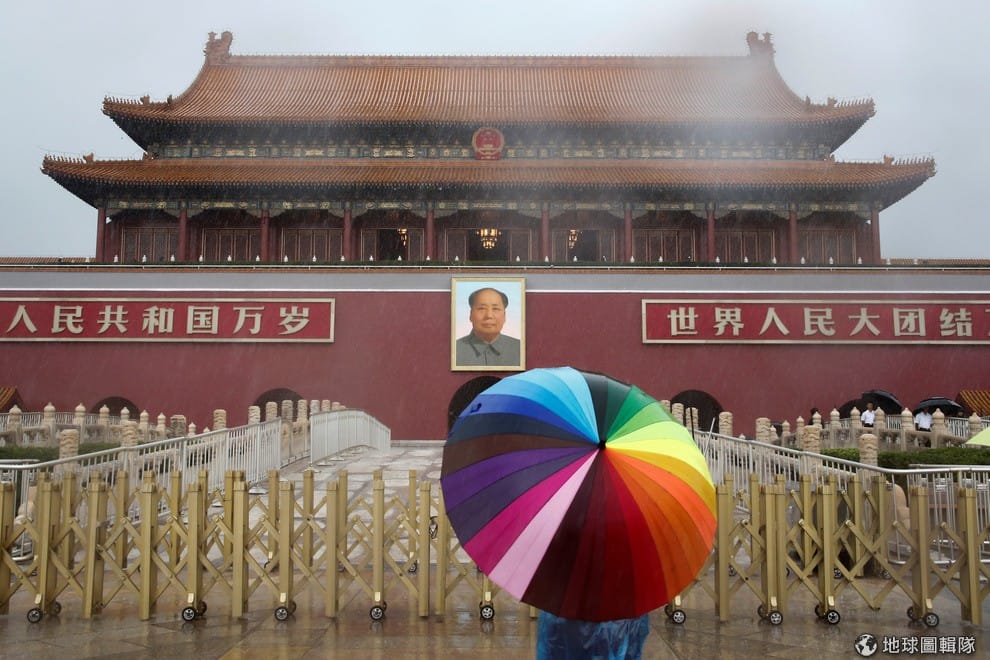一名遊客撐著彩虹傘,站在掛有毛澤東肖像的天安門城樓前。在目前的社會氛圍下,要中國民眾互稱同志做不到。