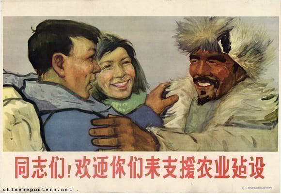 圖為中國文化大革命時期的海報,當時共產黨推崇知識青年下鄉去,張貼了許多海報宣導,海報上寫著「同志們!歡迎你們來支援農業建設」的字樣。