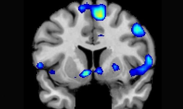 圖為實驗中受試者的大腦功能性磁振造影圖像,研究人員發現受試者在接觸到宗教信仰時,腦部掌管獎賞和成癮的部位會有反應。