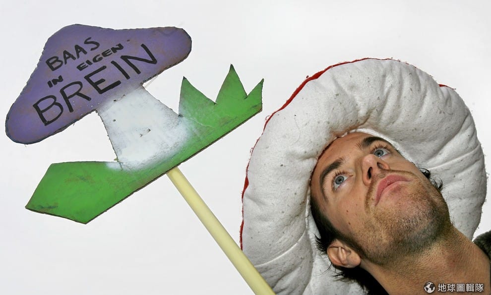 圖拍攝於 2007年,當時荷蘭決定要將迷幻蘑菇列入管制,引發許多人不滿。一名頭戴蘑菇的示威者拿著寫有「我們是腦袋的主人」的示威牌子。