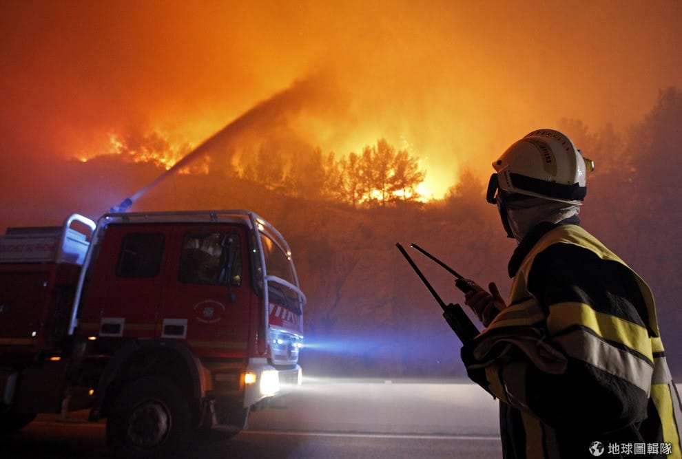 法國的消防員試著要撲滅松木林的大火。這場大火發生在 2010年,在強勁風勢的助長下,900公頃的松木、灌木叢通通付之一炬。