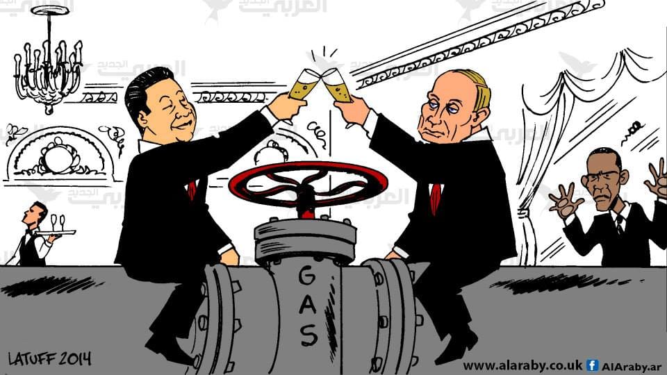 路透社在這則漫畫中,中國領導人習近平(左)和俄國總統普亭(中)因為天然氣合作計畫舉杯慶祝,獨留美國總統歐巴馬(Barack Obama,右)在一旁乾瞪眼。