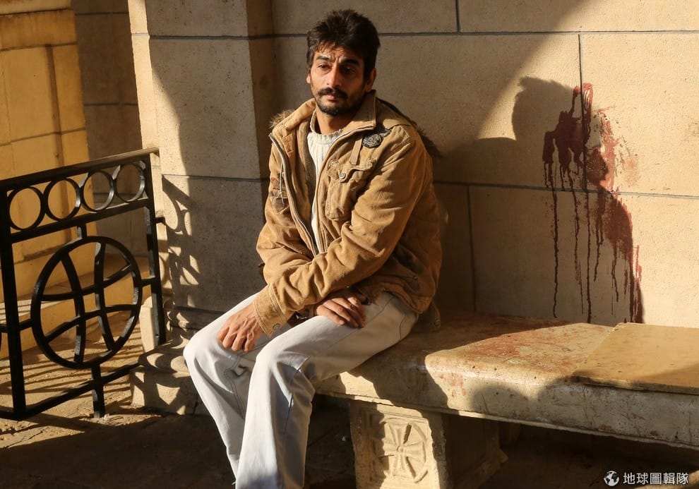 路透社一名基督教徒坐在長凳上,旁邊還有著因為爆炸案而留下的血跡。