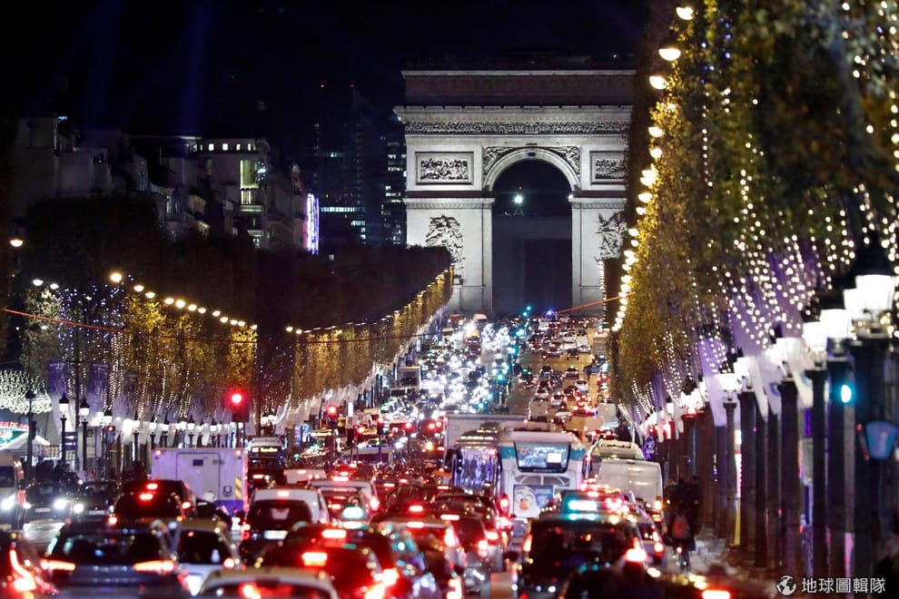 圖為法國巴黎香榭麗舍大道的景致,尖峰時刻的車潮把馬路擠得水泄不通。
