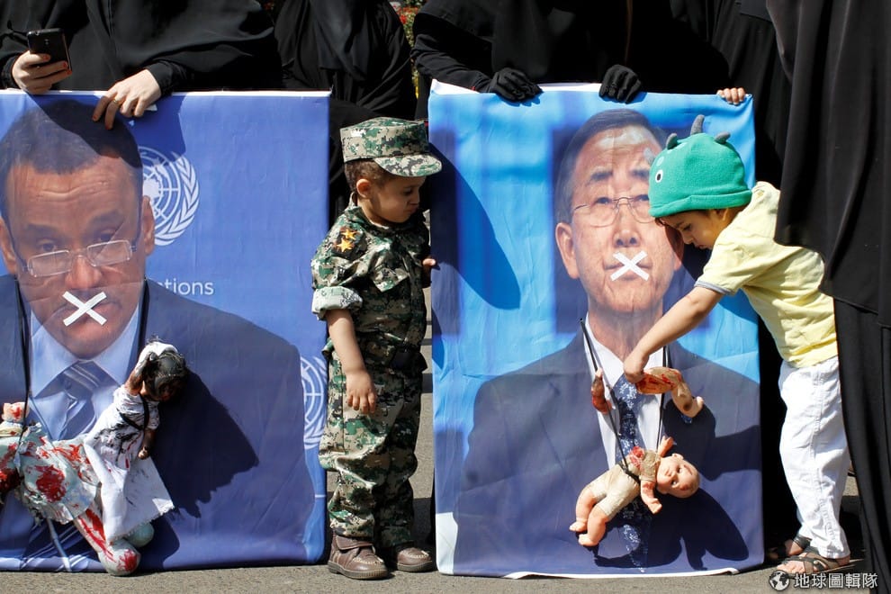 圖為今年 11月底,葉門人上街抗議阿拉伯聯軍對葉門的空襲行動,他們在聯合國秘書長潘基文(Ban Ki-moon,右)的照片掛上血跡斑斑的嬰兒娃娃,抗議聯合國默不作聲。