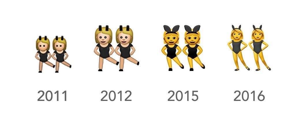 一開始這個表情符號代表的正是花花公子的招牌兔女郎,但現在已經演化成代表和朋友在一起同樂,此外,目前也有男性跳舞的版本。