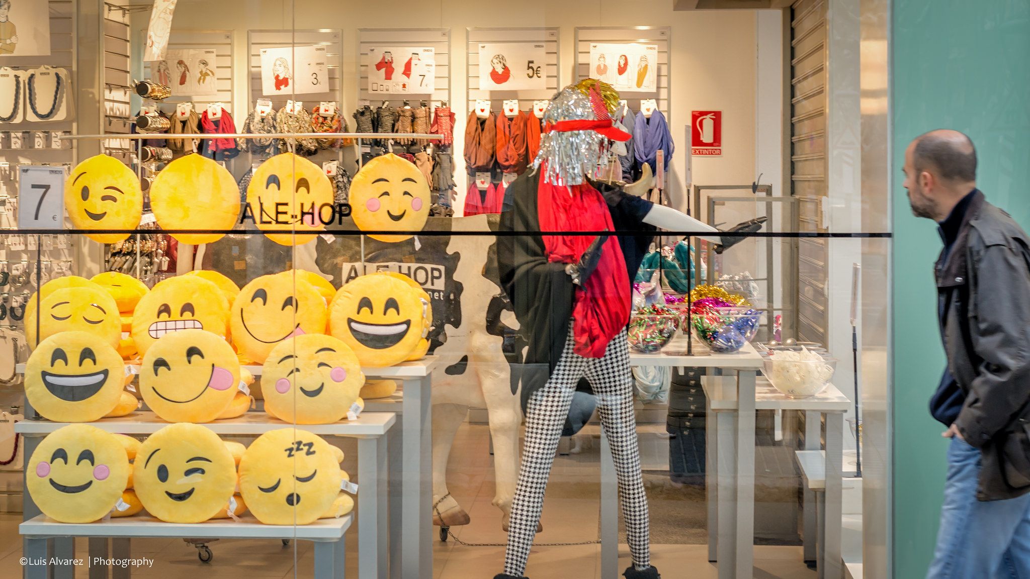 一名男子走過擺有表情符號商品的櫥窗。表情符號究竟是不是一種語言,仍是各界辯論的焦點。