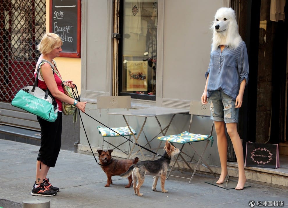 狗兒停在套著小狗頭套的模特兒前面,仔細打量自己的「同伴」。