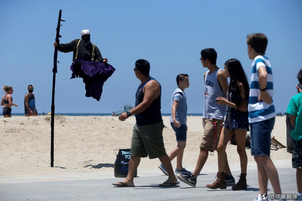 在洛杉磯的海灘旁,一名街頭表演者「漂浮」在半空中,引起路人的好奇觀看。
