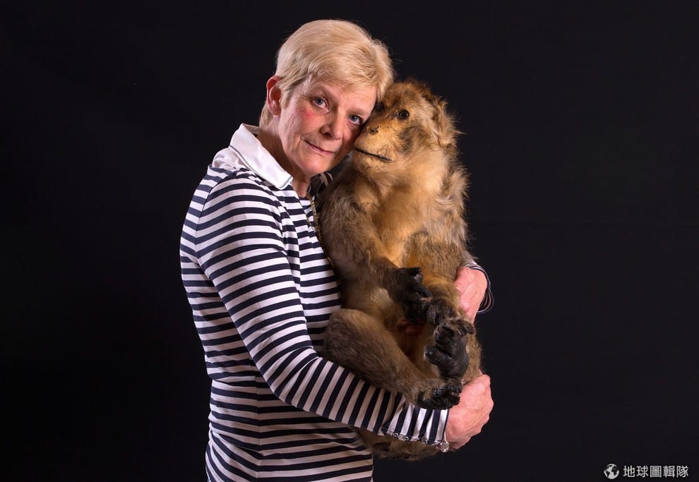 圖中的鮑切茲女士(Chantal Bauchez)抱著被製成標本的巴巴利獼猴毛吉斯(Moukys)。