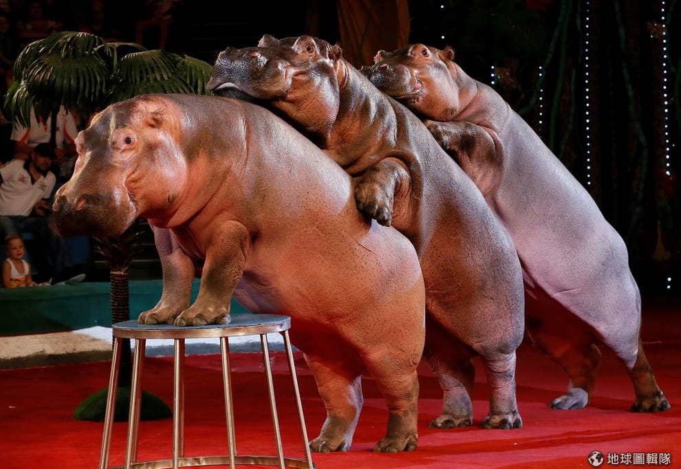 俄國克拉斯諾亞爾斯克(Krasnoyarsk)城市的馬戲團用河馬進行特技表演。