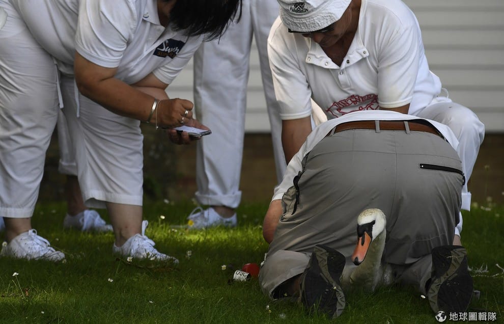 一隻天鵝從檢查人員的褲檔下鑽出頭,牠是泰唔士河中上百隻天鵝的一員,也是英國女王伊莉莎白二世的財產,每年,女王都會派出數天鵝大隊,好好關心一下天鵝的生活狀況。