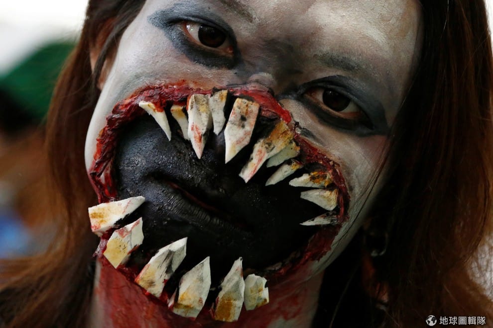 東京都南方的川崎市在 10月30日舉辦萬聖節大遊行,一名女子把自己打扮成大嘴怪。