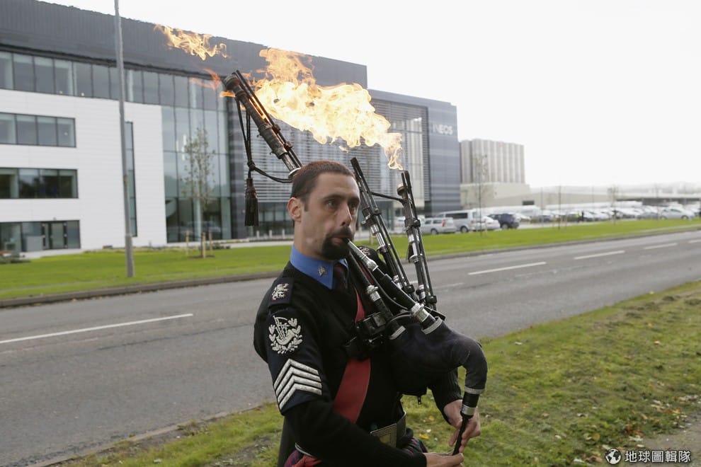 示威者到英力士(Ineos)公司前抗議該公司用水力壓裂法的方式開採頁岩油,一名男子則用會噴火的風笛展現他的不滿。