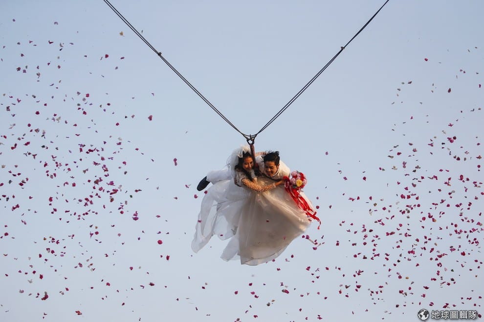 一對新人從纜繩上一邊降落,一邊接受眾人祝福。圖片拍攝於情人節前夕,是泰國某個度假村為了情人節特別設計的結婚典禮,當天一共有四對新人在這度假村舉辦婚禮。