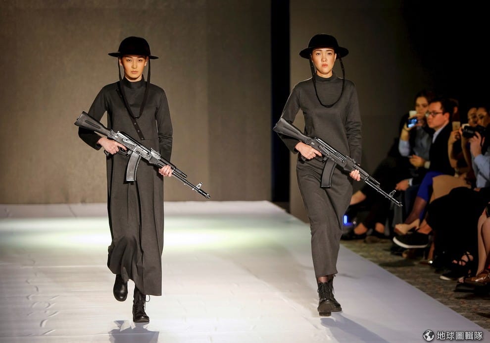 在哈薩克時尚周上,兩名手拿長槍的模特兒穿著哈薩克設計公司ABZAL的服裝,在伸展台上昂首闊步。