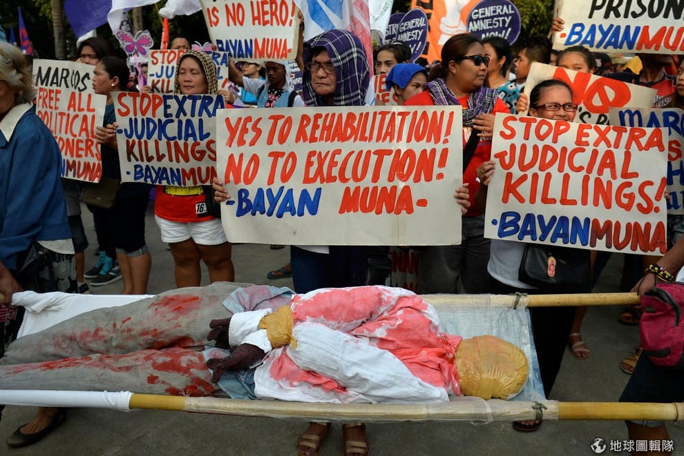 路透社在 12月12日世界人權日這天,人權分子手上拿著寫有「停止私刑」的牌子,在一具假屍體前抗議菲律賓當局過激的掃毒政策。