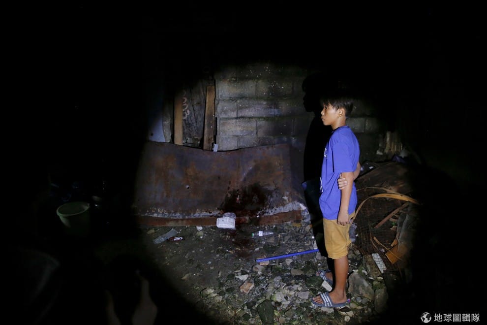 一名身穿藍色上衣的男孩看著父親被殺害的地點,他的父親在菲律賓當局的掃毒行動中身亡。