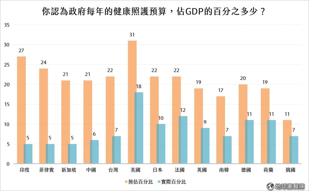 所有國家的人民都錯估了政府在健康支出的開銷,實際支出大部分都只佔了個位數的百分比,但人們總會想像政府在健康支出中花了更多錢。