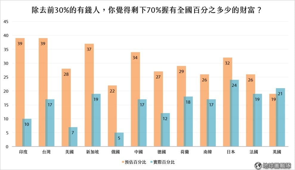 除了英國以外,所有國家都錯估的國內財務分配狀況,平均來說,70%的非有錢人只握有全國 15%的資源,但平均猜測值是 29%,足足是實際狀況的兩倍,由此可看出大部分人們所擁有的資源可能比想像中還要少得多。