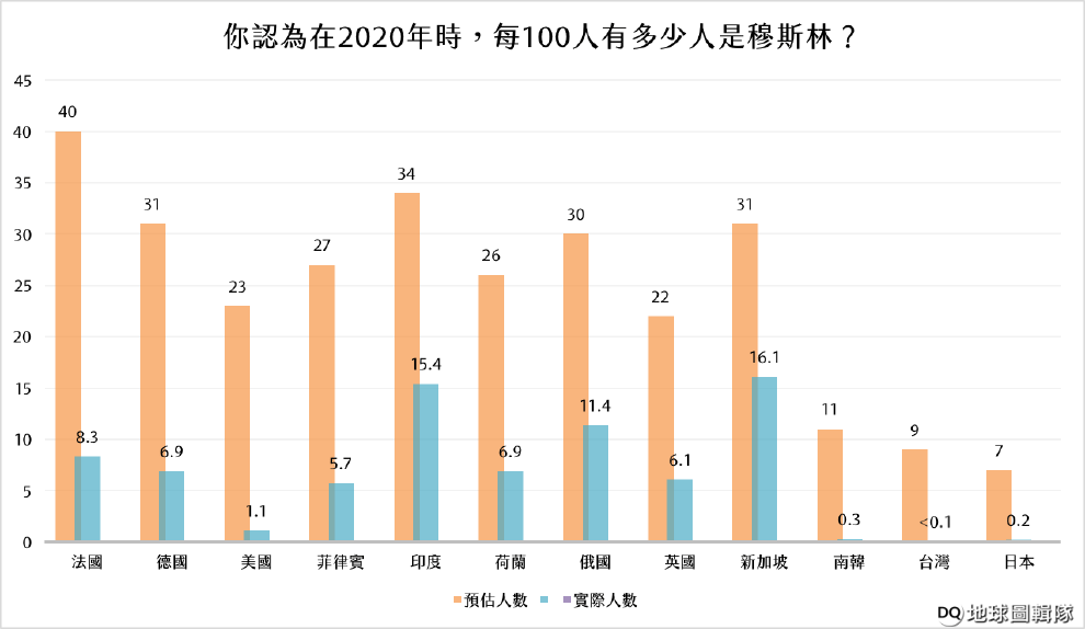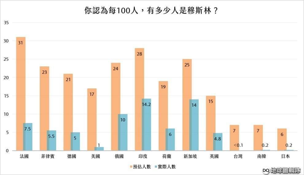 自從大量難民湧入歐洲、恐怖攻擊頻傳後,穆斯林便常常成被指責的對象,時不時也會聽到許多歐美國家的人民受不了國內有太多難民的聲音,不過研究指出,所有國家均嚴重高估穆斯林族群在自己國家的數量,其中最嚴重的是法國。法國人猜測平均每 100人大概有 31人是穆斯林,但是實際狀況只有 7.5人。