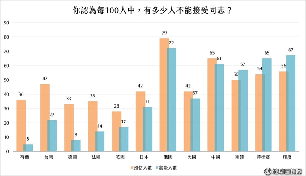 大部分的歐洲國家都會錯估社會對同志的接受程度,其中荷蘭人猜測有 36%的人不能接受同志,但實際情況只有 5%。