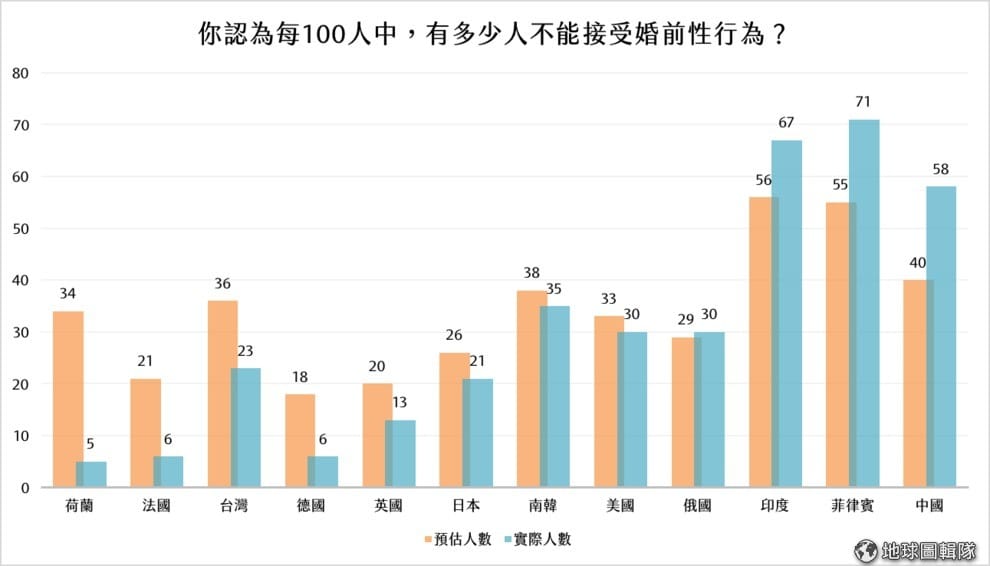 這一題落差最大的還是荷蘭,人們猜測有 34%的人不能接受婚前性行為,但實際情況是 5%。