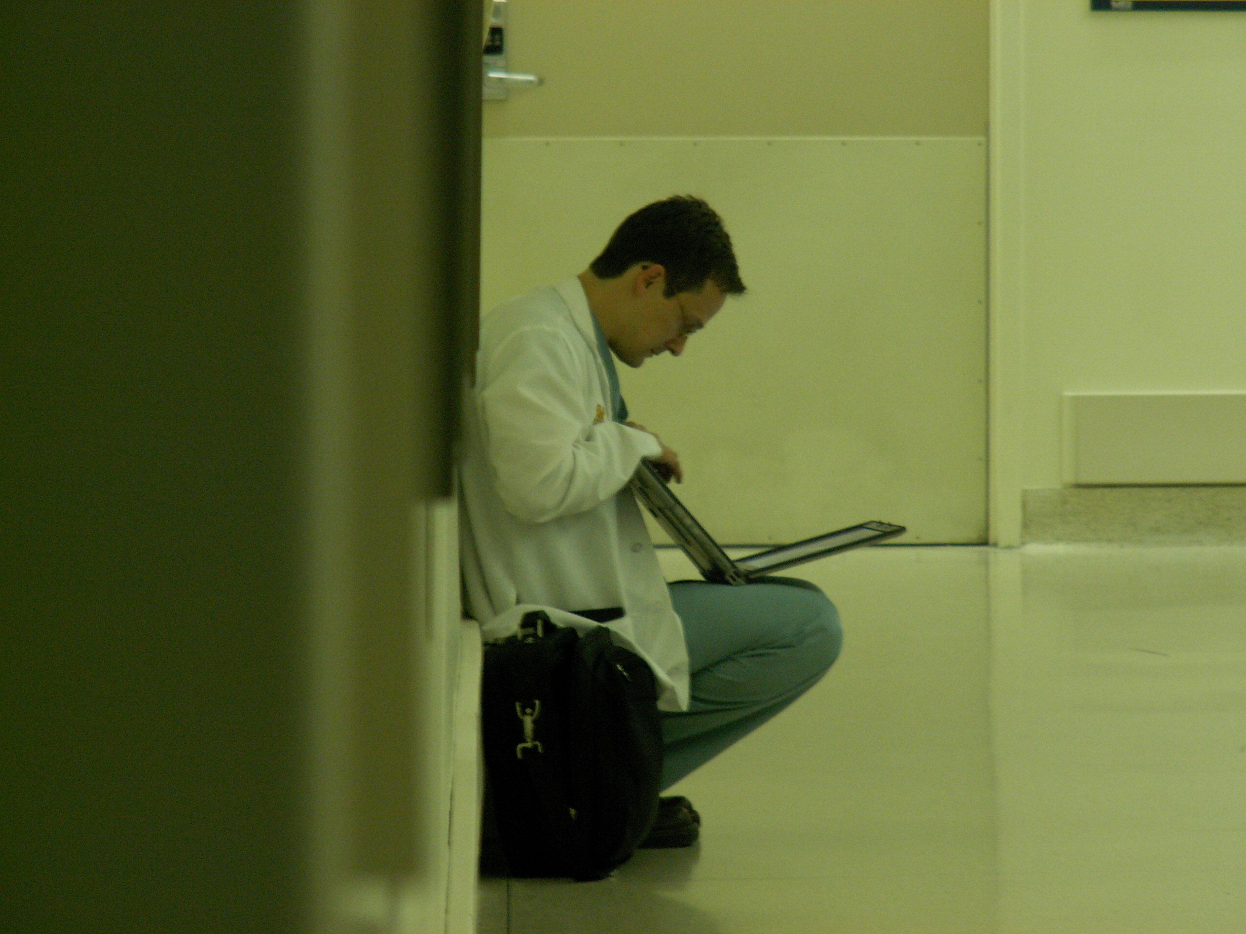 一名醫生穿著綠色值班服,直接蹲在地上查詢筆電上的資料。