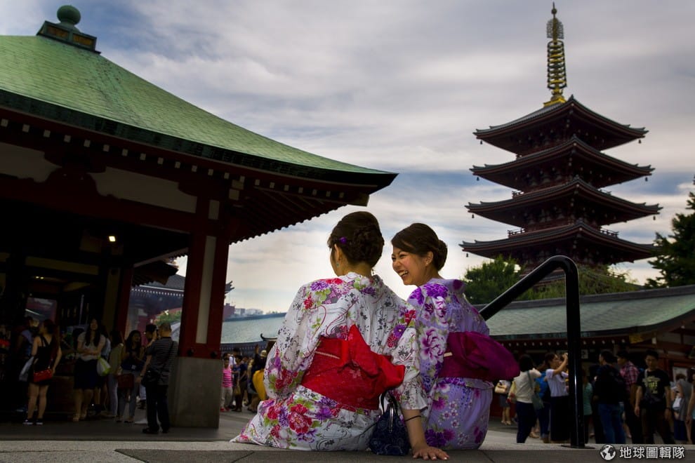 兩名穿著和服的女子,在東京淺草寺附近聊天。日本寺廟舉辦的聯誼活動出乎意料地大受好評,報名人數多到需要用抽籤的方式決定。