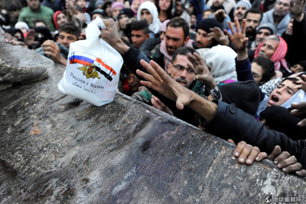從反政府軍佔領的東阿勒坡城,撤離到政府軍佔領區的人民,正爭相上前領取俄軍發放的物資,物資袋上方分別用俄文和阿拉伯語寫著:俄國與你們同在。