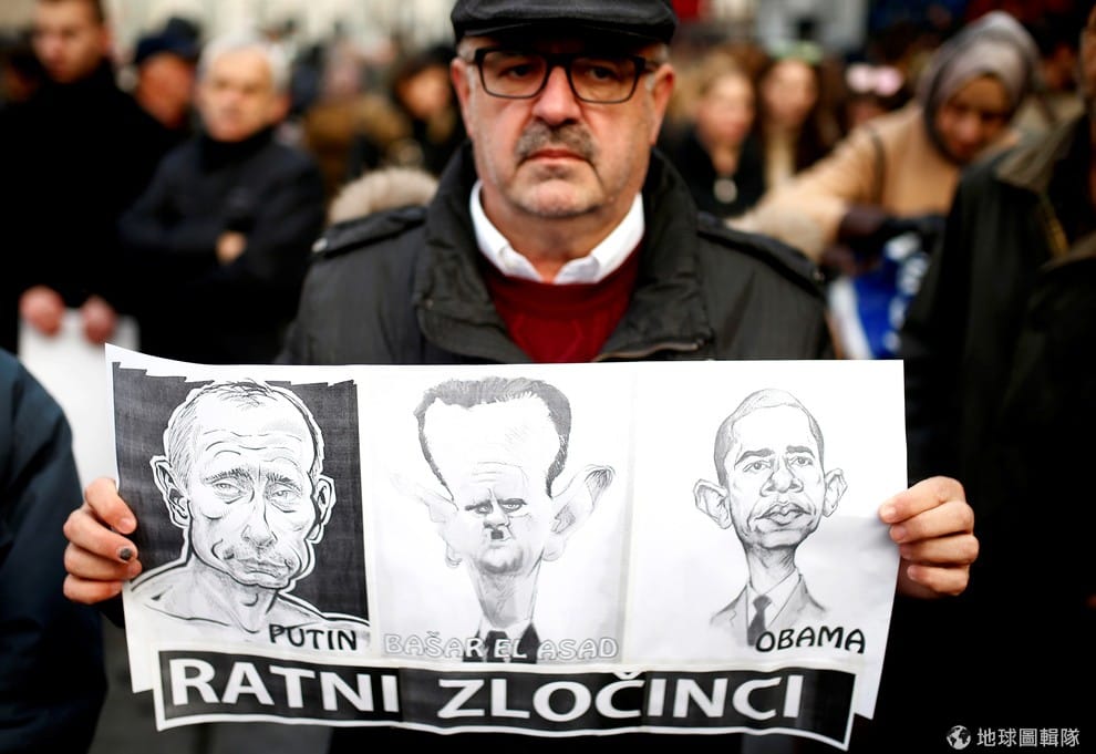 在波士尼亞與赫塞哥維納,一名示威人士手上拿著俄國總統普亭(Vladimir Putin)、敘利亞總統阿薩德、美國總統歐巴馬(Barack Obama)的畫像,認為他們均需要為此事負責。