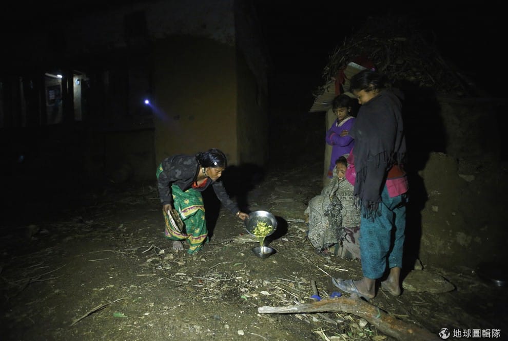 地球圖輯隊一名家庭成員把食物拿給因為月經正被隔離的女性(右二),在月經來的時候,她們可以吃喝的分量也會減少。