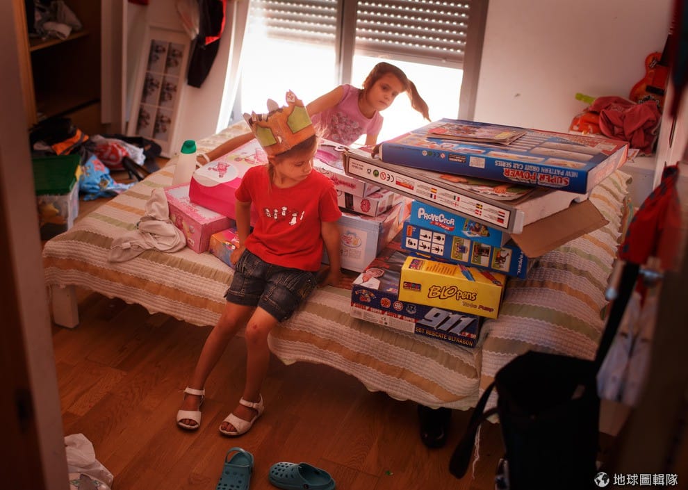 gettyimages雙胞胎姊妹正在床上看自己即將被賣掉換錢的玩具,她們跟爸爸媽媽被驅離出家門後,一起來到這座社區。